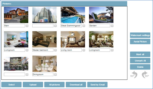 Photos on desktop or in folders can be selected using the mouse and dragged over the photo window and dropped there. Then all the photos will be uploaded to this property.